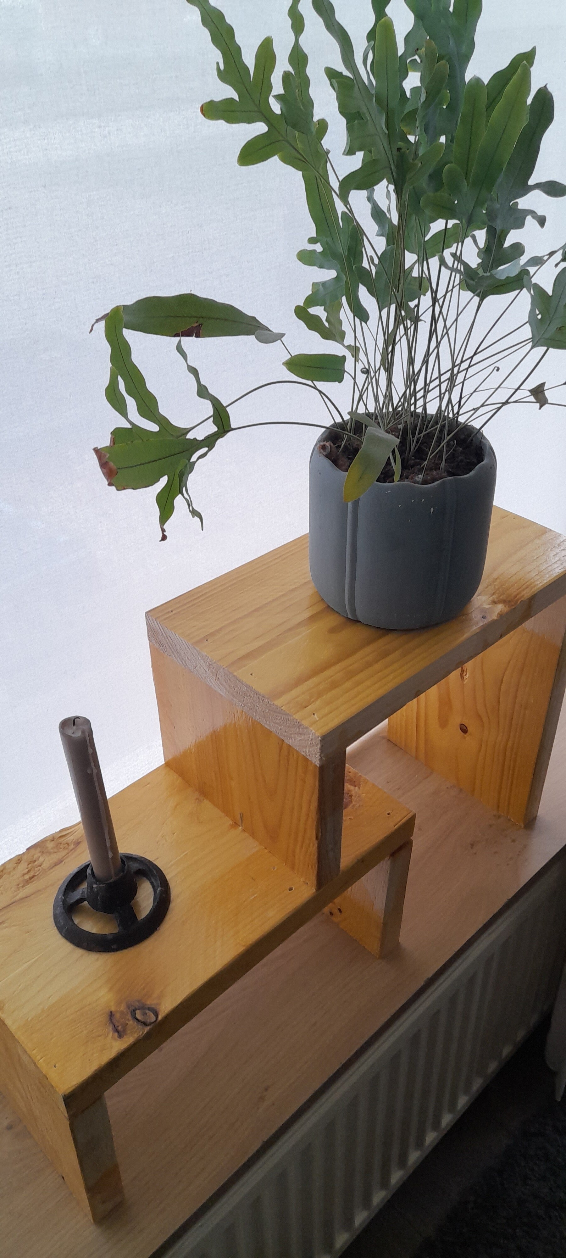 Vensterbank bankje gemaakt van steigerhout en afgewerkt met een laklaag.