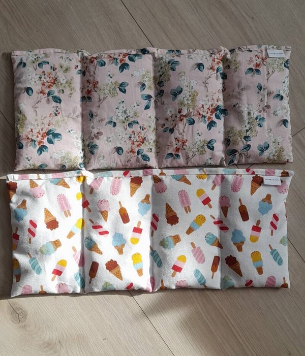 Een pittenzak gevuld met tarwepitkorrels. Kort verwarmen in de magnetron of natuurlijk lekker warm laten worden op de verwarming/kachel.