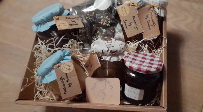 Zo kunt u bijvoorbeeld na een operatie of tijdens een revalidatietraject een alternatieve fruitmand cadeau doen. Een cadeaumand gevuld met onze huisgemaakte sappen, jam, moes en overige producten.